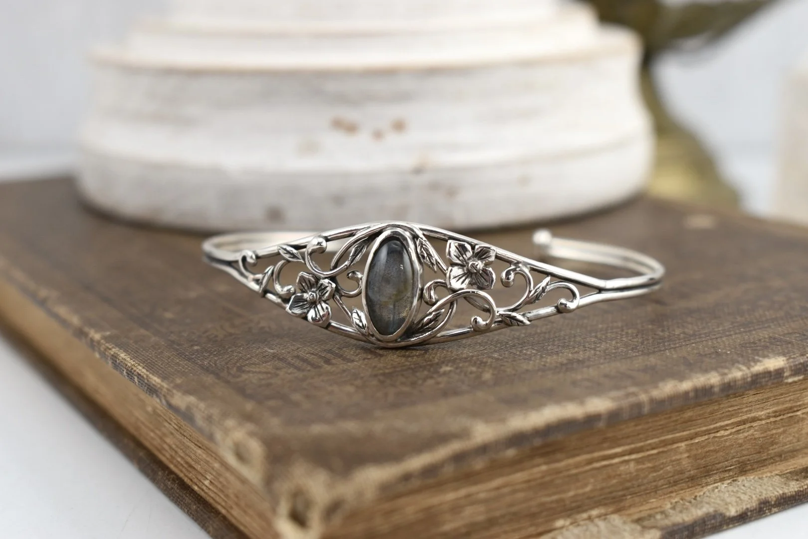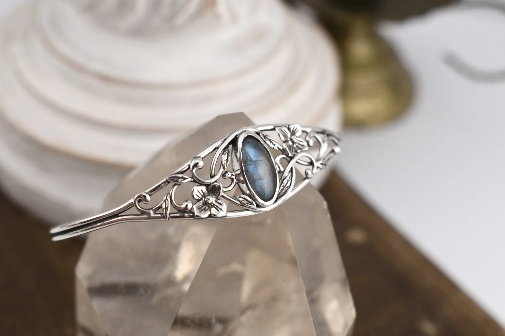 It is handcrafted from sterling silver, with a stunning Labradorite cabochon set in the center cradled by delicate silver scrolling vines and leaves with tiny Hydrangea flower accents. Inspired by Art Nouveau motifs and delicate English gardens.