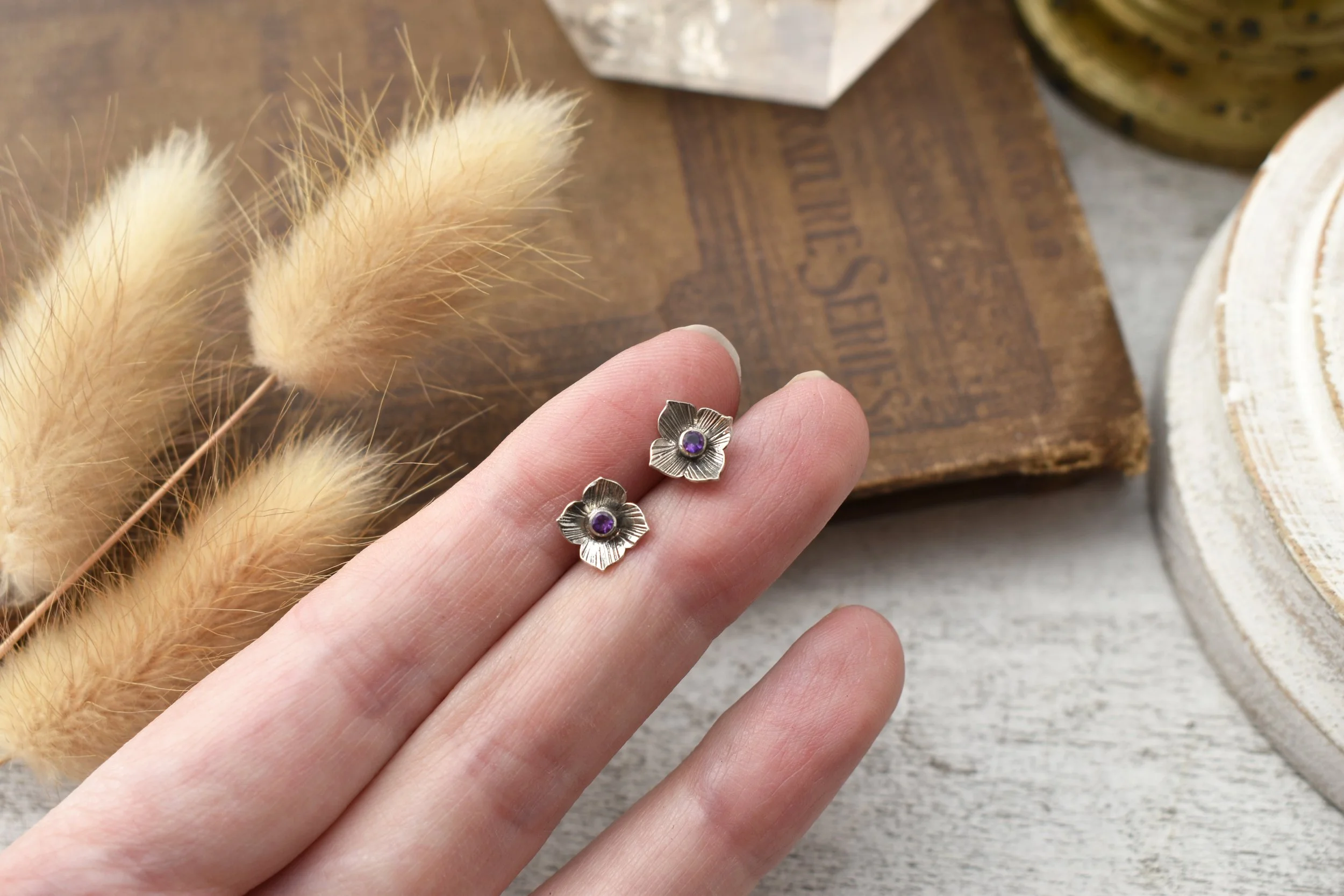 These adorable wee stud earrings feature two tiny handcrafted silver Hydrangea flowers with delicate petal detailing and two tiny Amethyst gems in their centers. The posts are also made from sterling silver and they come with little rubber backs.